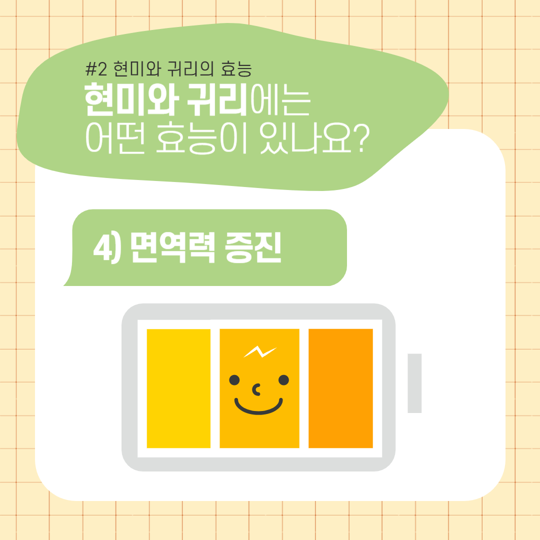 - 귀리 : 귀리에 함유된 비타민B, 비타민E, 셀레늄, 아연 등은 면역세포를 활성화시키고, 염증을 억제합니다.