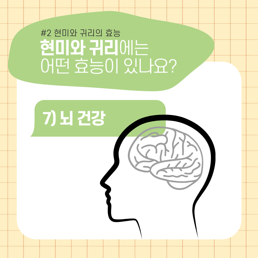 - 현미 : 현미에 함유되어 있는 페롤산은 뇌에 축적되어 있는 베타아밀로이드 펩타이드의 분해를 촉진해