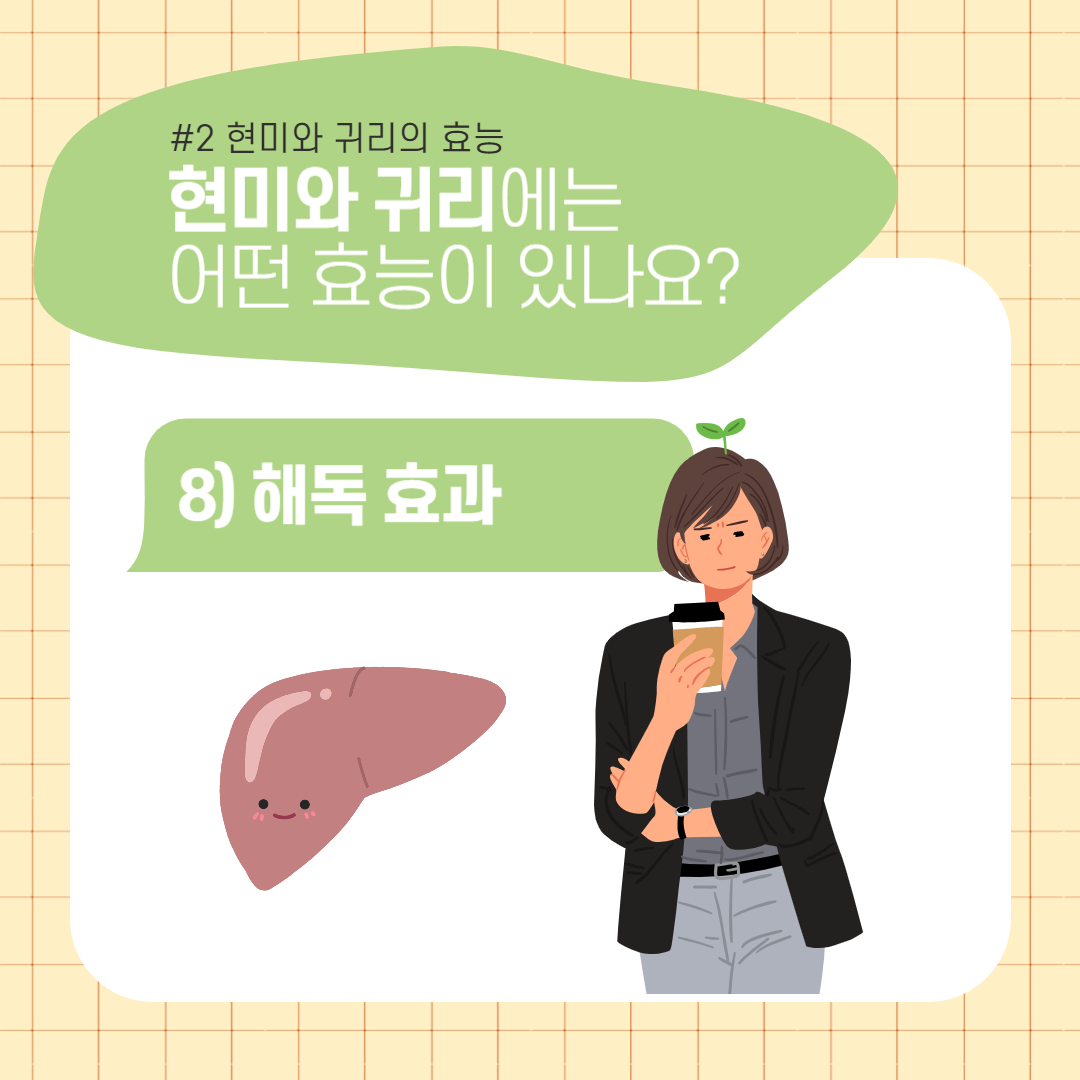 - 현미 : 현미의 피트산 성분은 해독 작용에 도움이 됩니다. 체내에 쌓이는 유해물질을 체외로 배출하는데 도움을 주고,