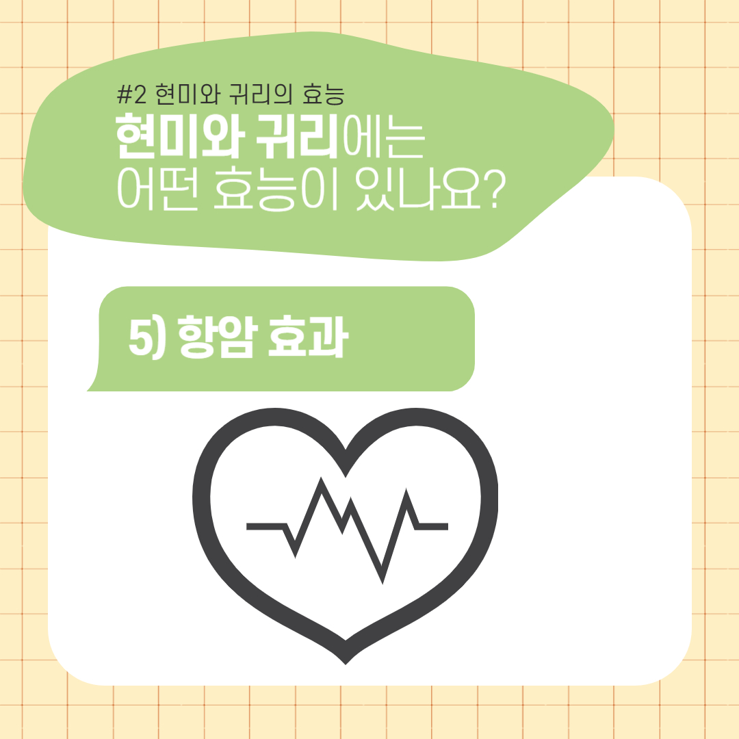 - 현미 : 현미 껍질의 셀레늄, 폴리페놀, 토코페롤 등의 다양한 항산화 영양소는 암세포 증식과 성장 억제에